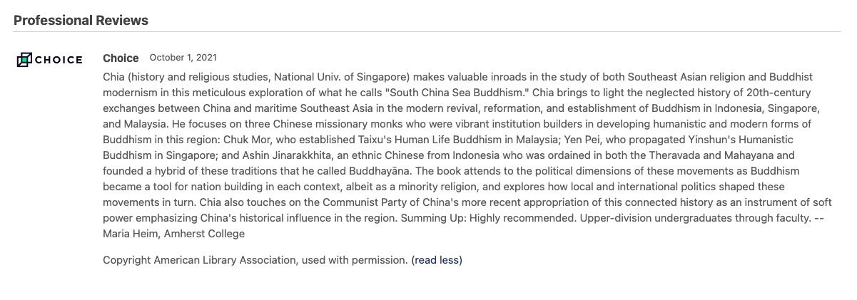 “In my view, this is compulsory reading for scholars with an interest in modern Chinese Buddhism and in the modern religious landscape of Southeast Asia.” ― Ester Bianchi, H-Buddhism